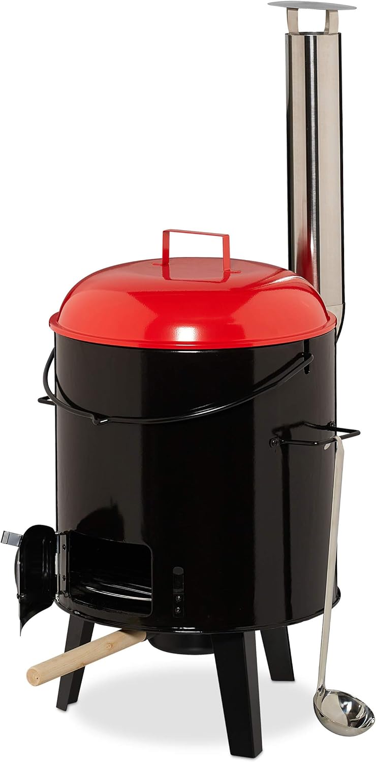 Relaxdays Barbacoa Portátil con Olla Esmaltada de 14 Litros, Parrilla para Cocinar y Preparar Guisos, Barbacoa de Madera para Camping, Color Rojo y Negro, 48 x 68 x 90 cm