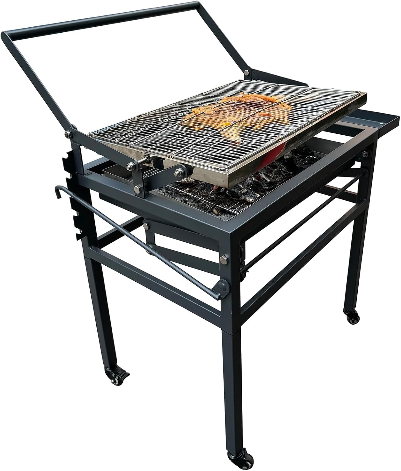 Parrilla de Barbacoa Portátil de Carbón con Parrilla Giratoria 360°, Rejilla de Cocción de Acero Inoxidable y Bandeja de Carbón Ajustable, con Ruedas