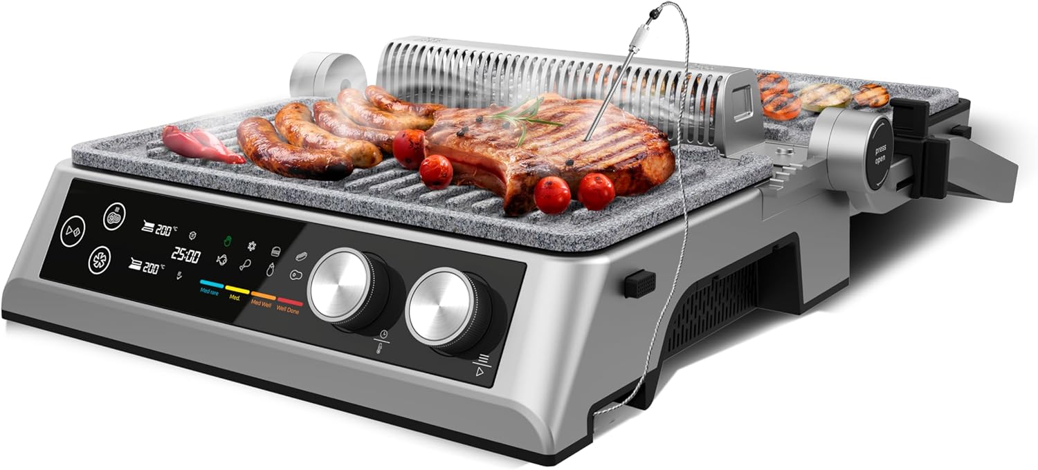 Con una potencia de 2400 W, la parrilla proporciona un calentamiento rápido y uniforme, adecuado para cocinar carnes, verduras, pescado y otros alimentos con buenos resultados.