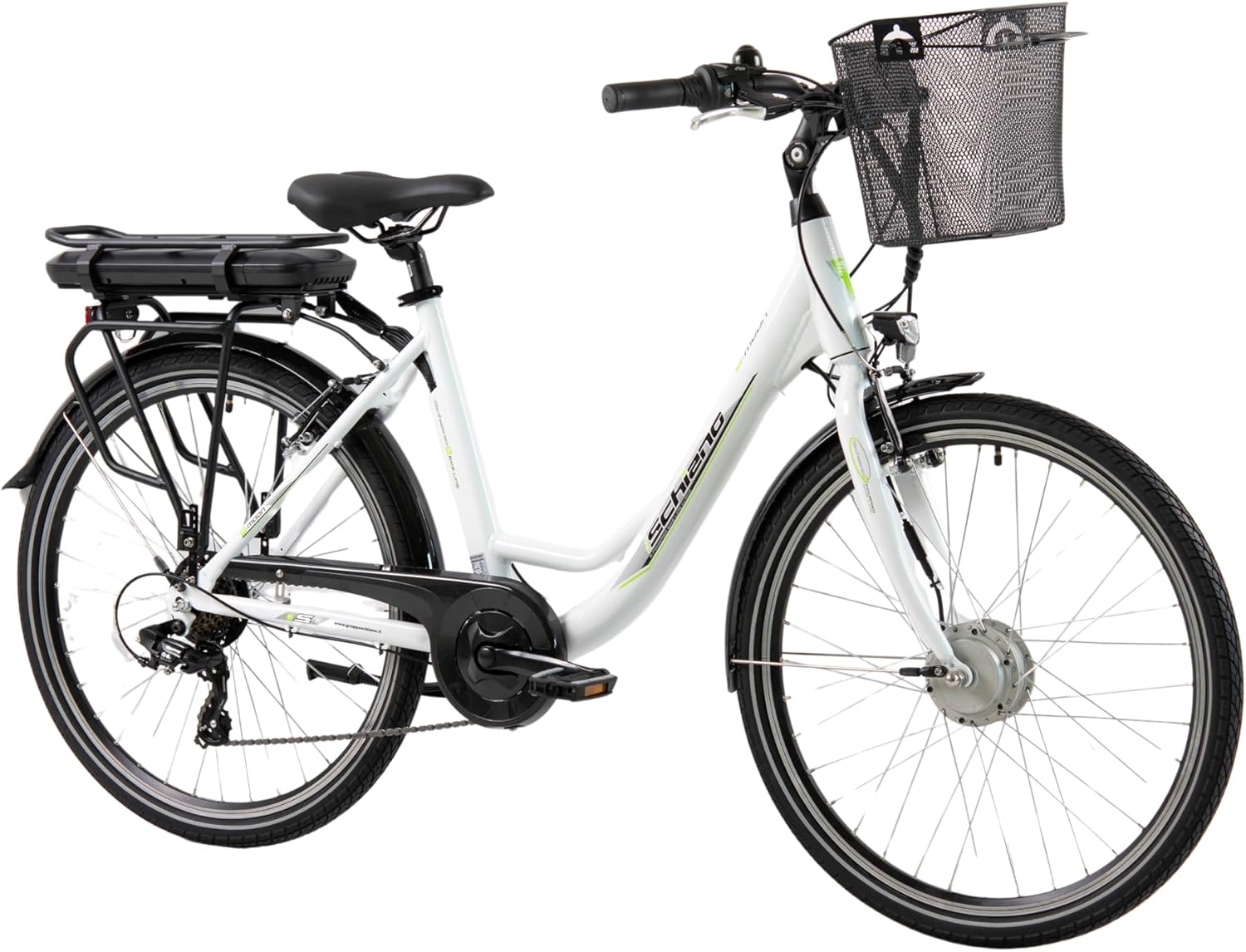 La F.lli Schiano E-Moon es una bicicleta eléctrica de ciudad diseñada para desplazamientos urbanos cómodos y eficientes. Su diseño moderno en color blanco y su estructura ligera la convierten en una opción práctica para trayectos diarios en la ciudad.