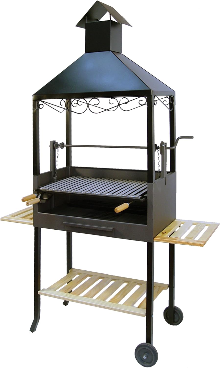 Fabricada con una combinación de hierro, acero inoxidable y madera, la barbacoa ofrece una estructura robusta diseñada para el uso frecuente en exteriores.